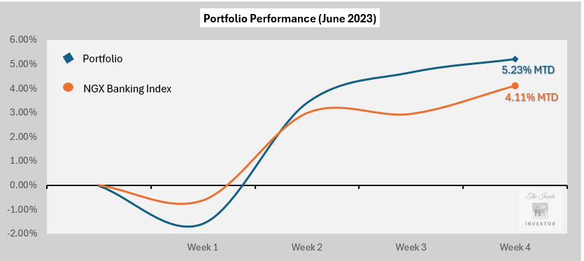 Our portfolio achieved a return of 5.23% month-to-date (MTD) for June, which was 1.12% higher than the NGX Banking Index at 4.11% MTD. Both started the month on a negative note, with the index initially outperforming our portfolio in the first week of June. However, starting from the second week, there was a shift in performance, leading to a widening of the performance gap between the two.