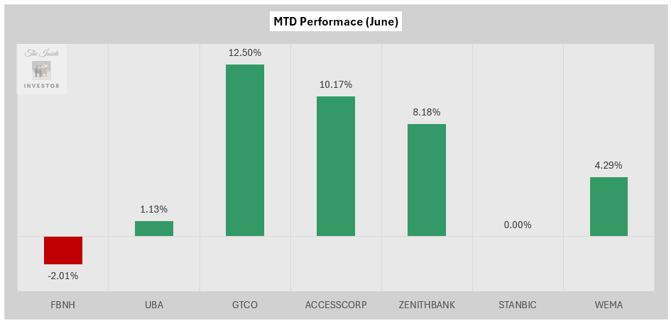 In June, 5 of the 7 stocks in our portfolio closed in the green, with GTCO emerging as the top gainer, while FBNH disappointed despite beginning the month on a positive note. Furthermore, GTCO was the only stock to post three consecutive week-on-week gains. Stanbic ended the month flat, despite starting on the right trajectory.
